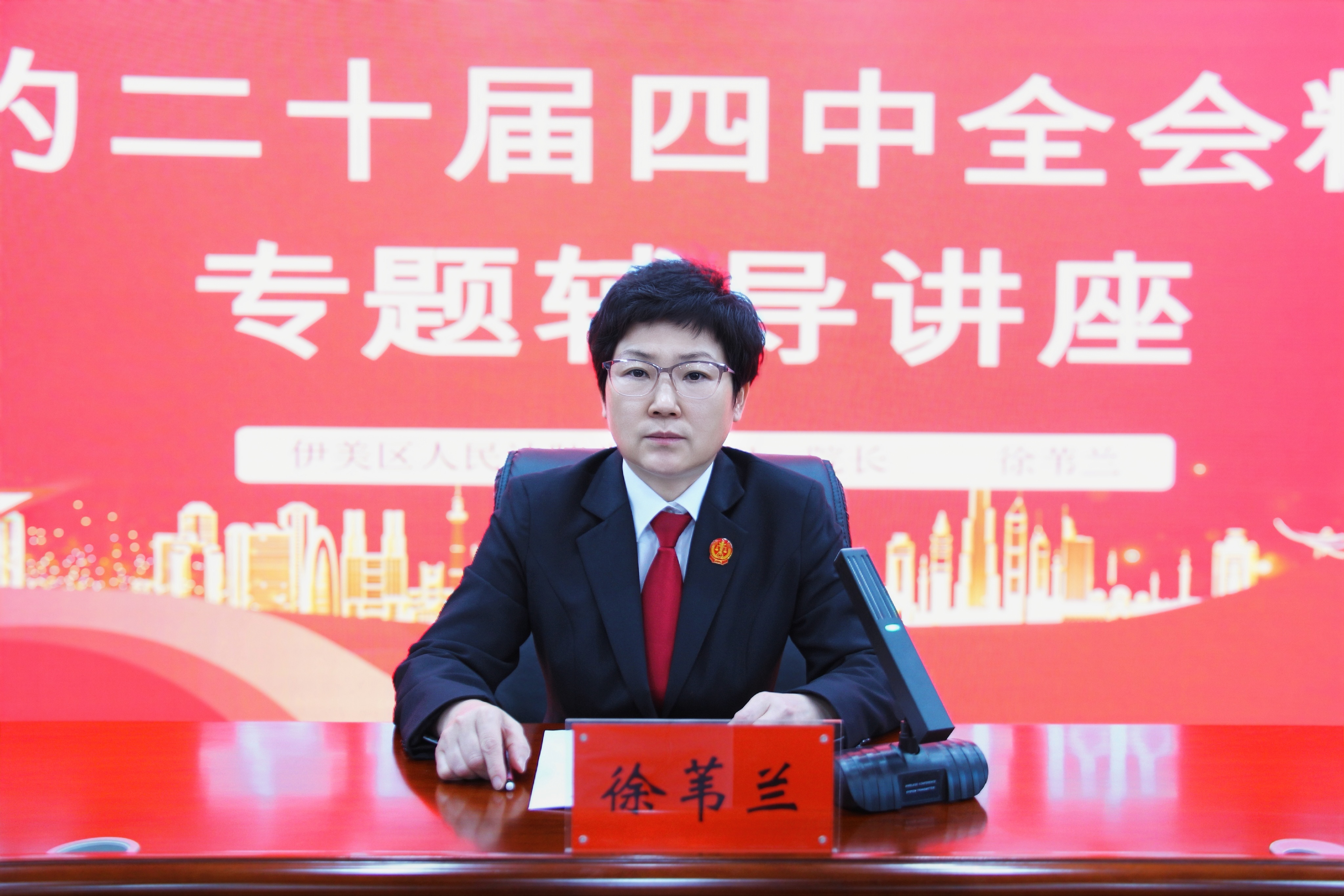 为深入学习贯彻党的二十届四中全会精神,切实把全院干警的思想和行动统一到党中央决策部署上来,伊美区人民法院举办党的二十届四中全会精神专题辅导讲座,党组书记、院长徐苇兰作专题宣讲,全体干警参加会议。